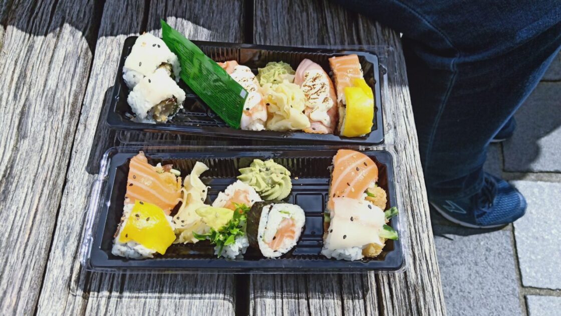 Two things not considered on my possible lunch list today were dried stock fish (hanging from the ceiling) and small oysters at NZ$10 each overdressed with piped cream cheese and parsley. Our lunch came from the ‘Roll on’ section of the market, it serves sushi either premade or personally made for you. NZ$35 buys 12 pieces, a large dollop of wasabi, ginger that isn’t pink and soy sauce. Interesting fact: the use of salmon in sushi was suggested to the Japanese by a Norwegian delegation in the 1980s. We got the takeaway sushi and sat in the sun outside the restaurants seating the richer dinners.