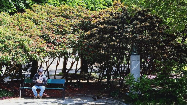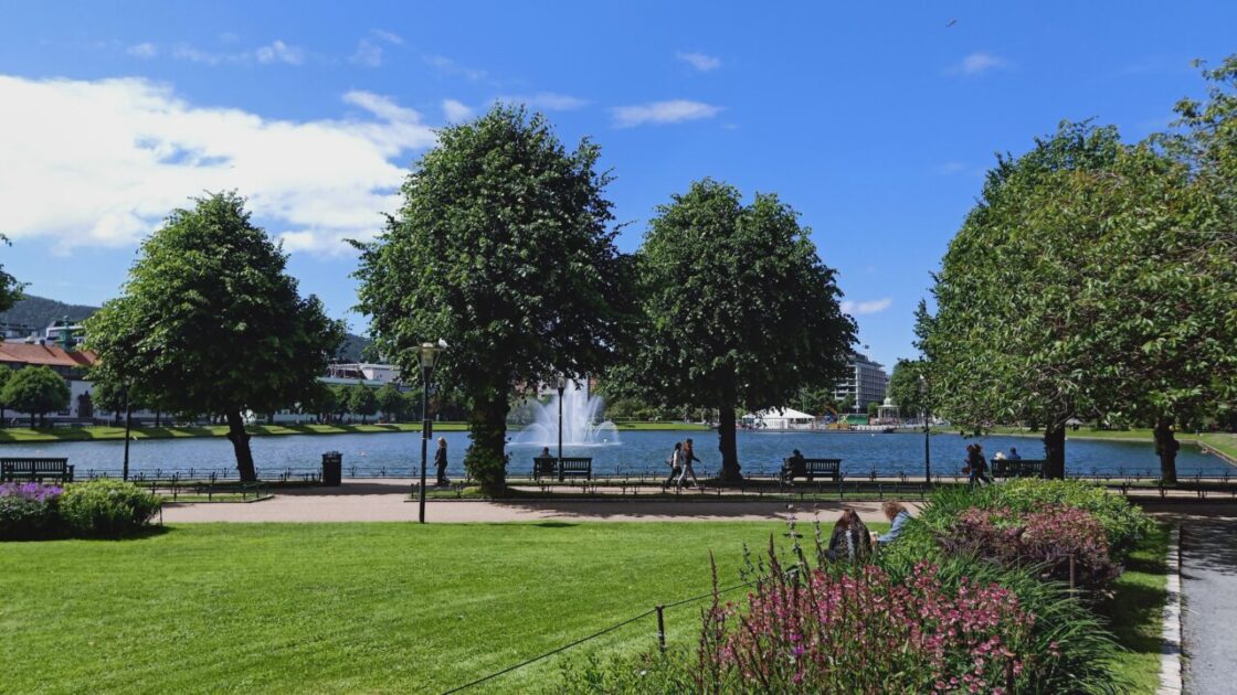 Next stop was at the central lake, fountain, and gardens for a geocache. The cache is near what is supposedly the first ever Rhododendron in Norway, we will have to believe the cache owner that this is the one; an internet search does verify some information about rhododendrons in Bergen around 1787. Apparently they like bog soil in mild and moist conditions and therefore Bergen provides the perfect growing conditions.