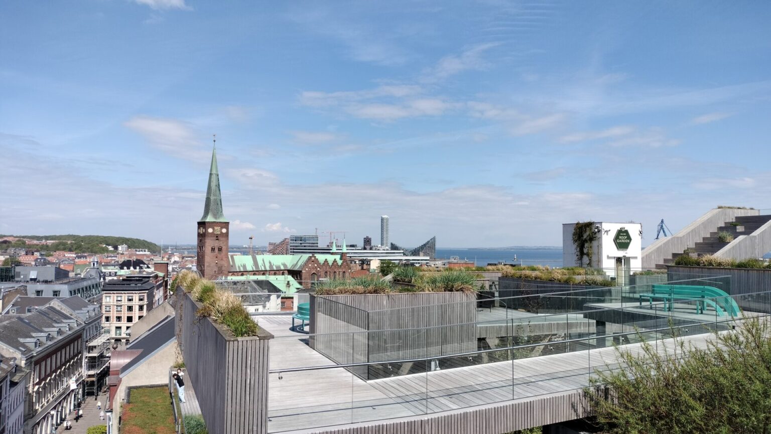 Our second geocache was on top of the Salling Department Store (free entry). The AROS museum down the road has access to the roof and a very expensive 360 degree panoramic rainbow coloured glass skywalk that can be experienced for NZ$50 each. We chose to do the cheaper and more interesting option which is to take the elevator to the rooftop garden terrace on the 6th floor of Sallings Department Store. You get the same 360 degree panoramic view for free and can look back at the more expensive rainbow one. There are several terraces, a garden, artwork, a café, a wine bar and a glass skywalk that goes out over the street below.