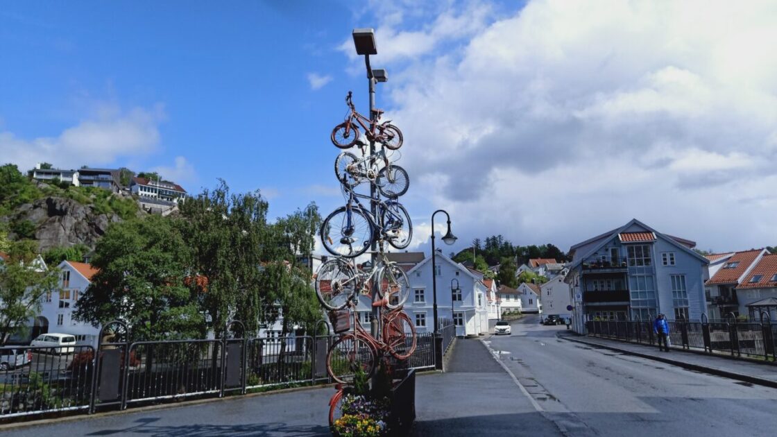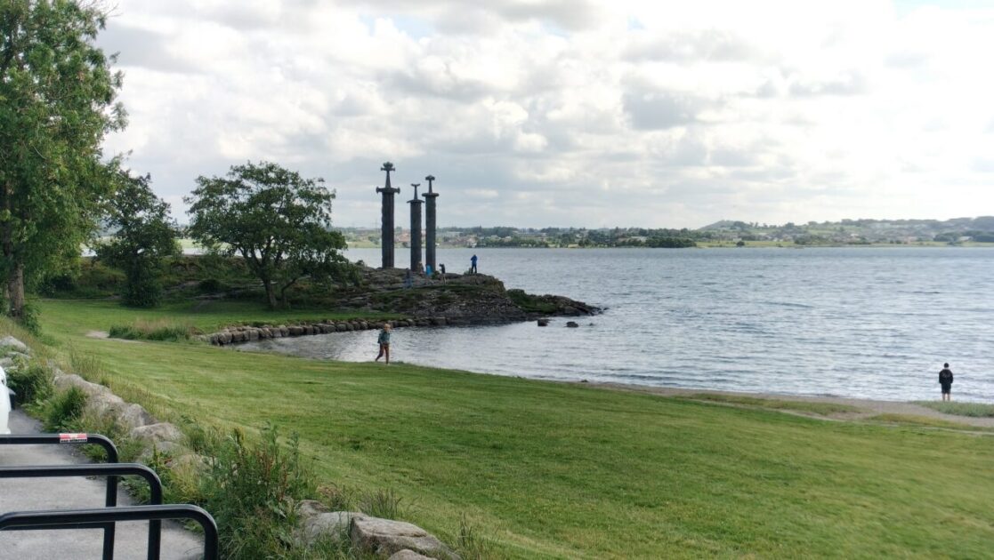 Another random pullover spot, my choosing, the ‘three swords’ monument for the great naval battle of Hafrsfjord, 6km south of Stavanger. Viking Chief Harald Fairhair unified the three districts of Norway around 872 by beating up two other petty-chiefs and their men. He claimed the kingdom of Norway and became King Harald I. The big sword represents his victory; the two smaller, his opponents. They are stuck in rock to symbolise peace. Obviously King Arthur didn’t exist back then.