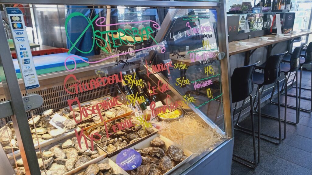 Torvehallerne: Two market halls have been revived from old. They sell fresh fish, meat, fruit & Vegetables, flowers, deli goods, and many more food and drink items. They also have wine bars, coffee outlets and lunch bars. We went naturally for the French filled baguettes and not the traditional Danish open sandwich; there was just too much raw onion and unidentifiable items in the Danish sandwiches. I would liked to have tried their fresh oysters but as you may be able to see in the photo they were NZ$9 each or NZ$96 a dozen. That should stop the Bluff oyster fans complaining about the price back home. The different names listed on the counter glass are where they come from. If you are shocked at the price of oysters, the best Rib Eye Steak costs over NZ$200 a kilo.