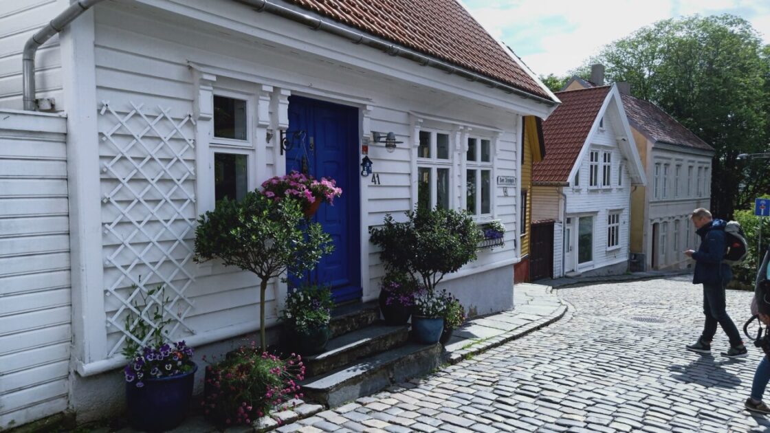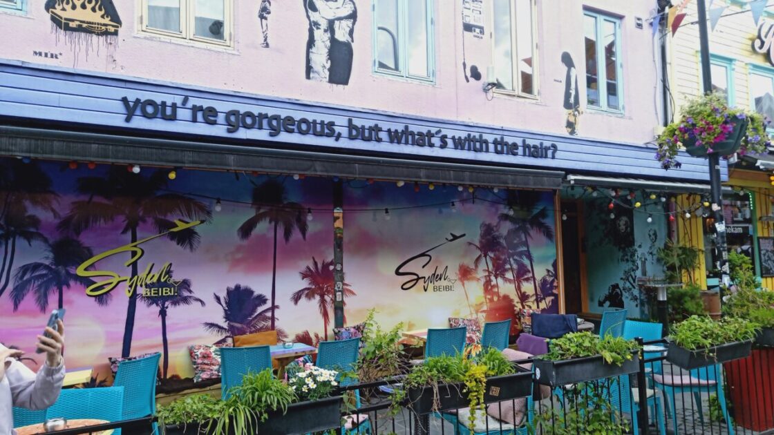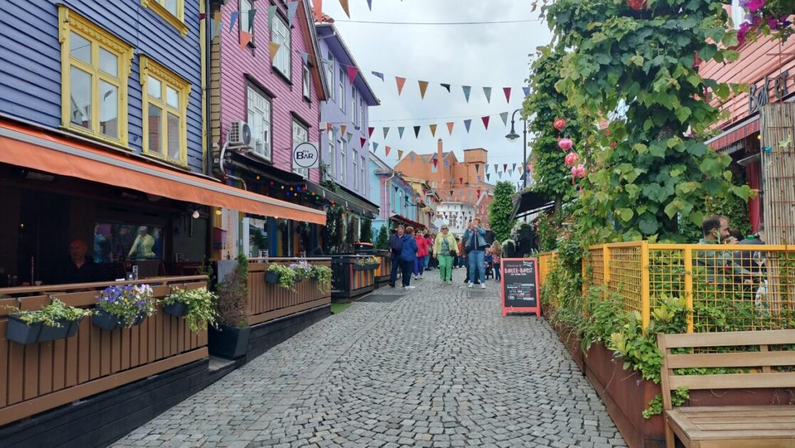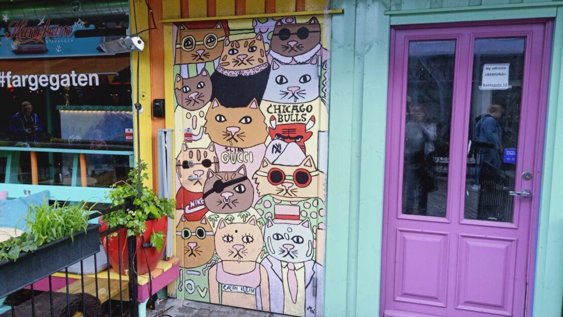 These photos are of colourful Fargegaten Street where the buildings have been painted pastel shades and an artist has added extra colour.