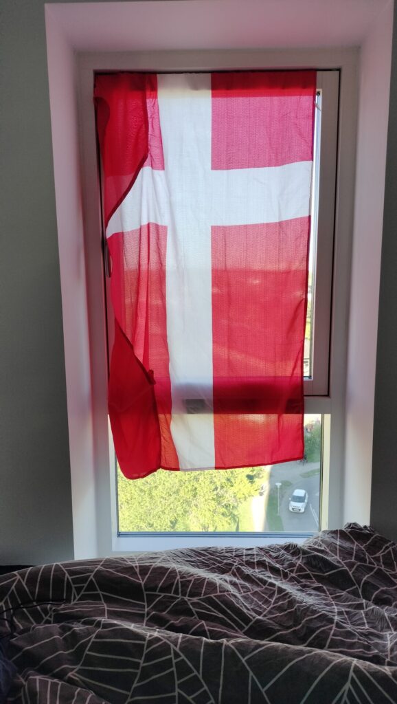 To show my allegiance to the happy nation I replaced my tissue makeshift curtain with a Danish flag bought from the local Red Cross store.