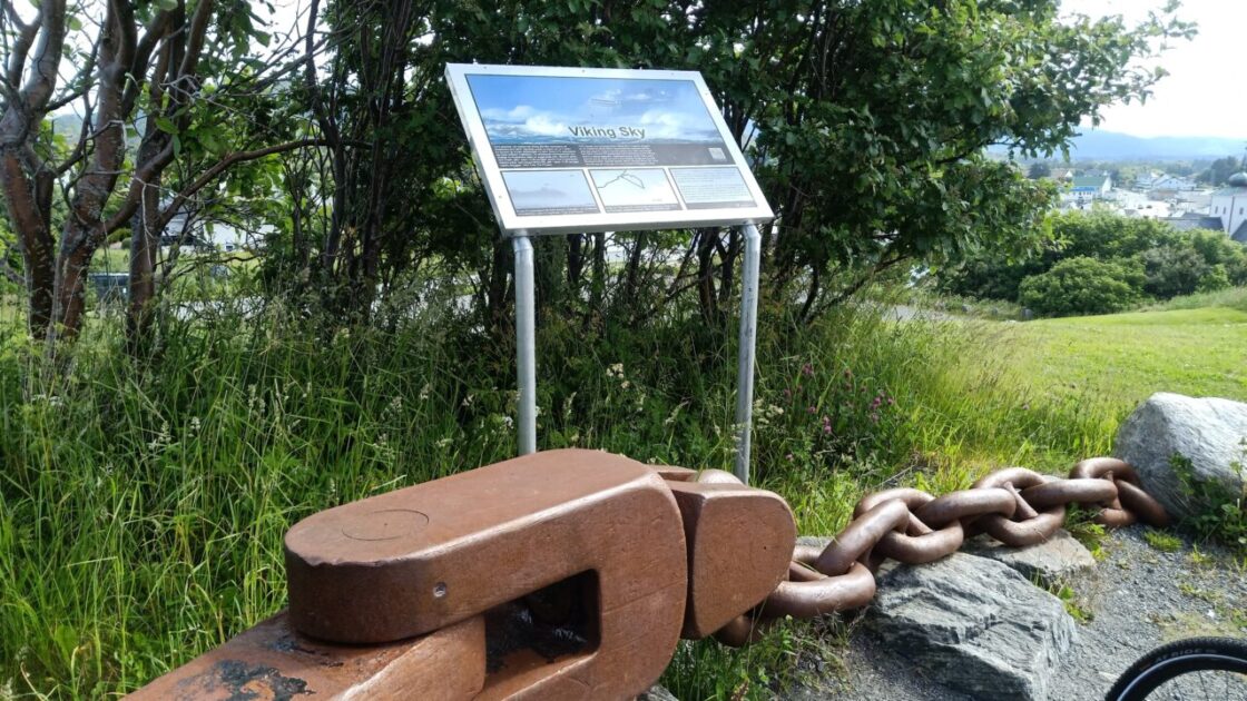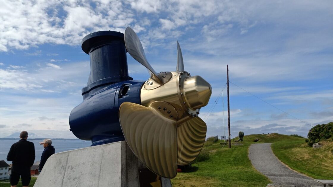 The suggested road for tourists to get to Kristiansund is via the Atlantic Ocean Road which is an 8.3km stretch of road that runs through an archipelago connecting the main land with the island of Averoy. From Averoy there is a 5.7km undersea tunnel connecting you to Kirkelandet, Kristiansund. The guide books suggest you start your journey from either Eide or Bud, so we went for Bud. The photos here show the outdoor museum area of World War battlements, an old cruise ship propeller used to make the boat go sideways into dock, part of the anchor off the Viking Sky that ran aground nearby, and the fantastic view; the sky was still blue at that point.