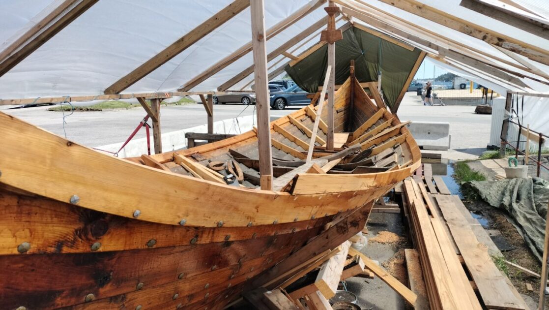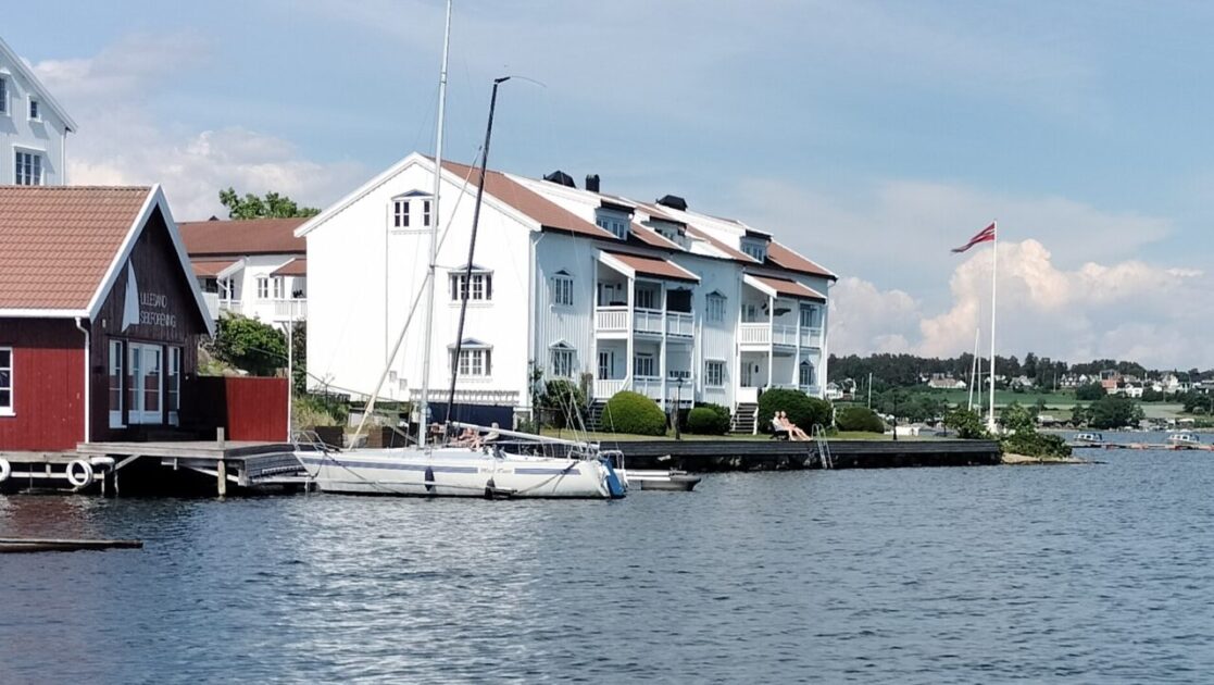 Our next and unplanned geocache stop was at Lillesand, an old ship building area. Another beautiful harbour with a geocache in a book exchange made from an old ship’s wheelhouse. Book exchange caches are our nemesis, this is our 5th one and finally we found the cache. You couldn’t miss it; like the one in Grimstad it was a big box with geocaching written all over it, at eyelevel, straight ahead from the doorway. We swapped a book and went off to view the Viking ship replica being built.