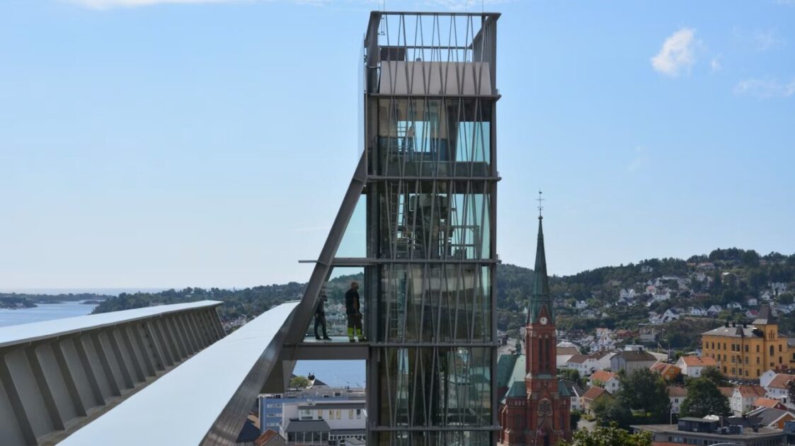 To allow easy access for the residents they installed an elevator from the old town centre to the new. Access is by a tunnel, then an elevator that goes 40 metres up through the hill and then travels a further 20 metres in a glass elevator shaft, allowing panoramic views. From the elevator there is a bridge connecting you to the new town hall area or, for the faint hearted, just drive up to the free car park.
