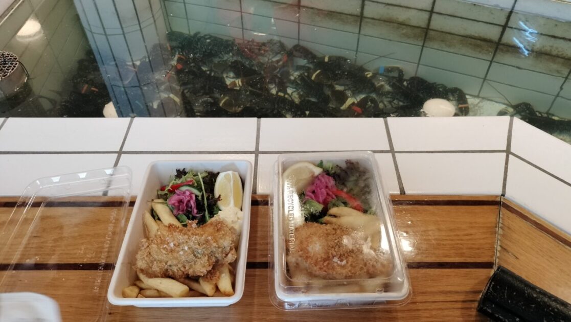 We got off the bus in the city and went straight to the ‘Travel Bug Hotel’ Geocache. We were muggled by a lovely German couple who had done ten caches to our one. We celebrated beating them to the prize by going to lunch at the fish market, a colourful wharf area, where the cruise ship offloads its patrons. Lunch was crumbed cod and chips NZ$25 each, consumed while watching the tourists choose their more expensive lobsters.