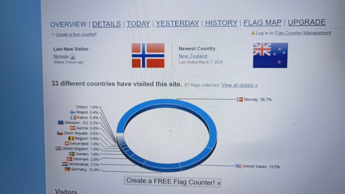 Some geocache listings have a flag counter showing where all the people have come from who found their cache. The photo shows that we made geocache headlines by being the first New Zealand geocachers to find the Travel Bug Hotel in Kristiansand, whoopee.