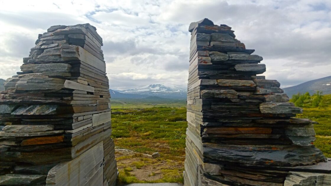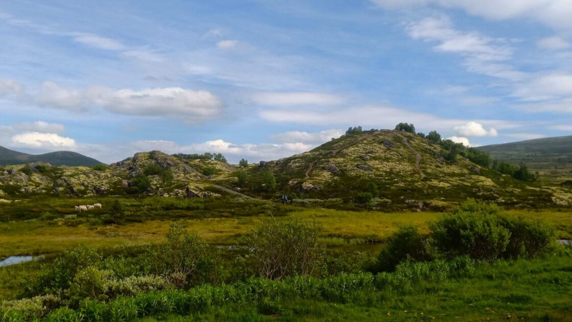 The photo on the left is a monument near the highest point on the E6 road at Dovre Mountain. It is 1,000 metres above sea level and has views of Snohetta, which was covered in snow and cloud today. The photo on the right is where the GPS took us, 6kms down the road and by a little knoll with sheep wearing bells, and not fenced from the road.