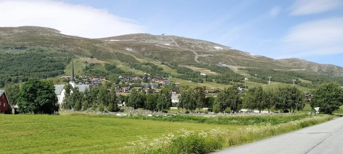 There are numerous ski fields and resorts in the mountains, unlike NZ where you drive up the mountain to the ski field, here the ski fields start close to the main road and the chalets. The photos above are the summer version of the Oppdal skifield that is at a latitude equivalent to being 1,500kms south of Dunedin. The runs shown are generally ungroomed Black to Brown and Blue. There are many, many dozens of these grass covered chalets in clusters close by. No doubt the free-heelers are catered for as well.