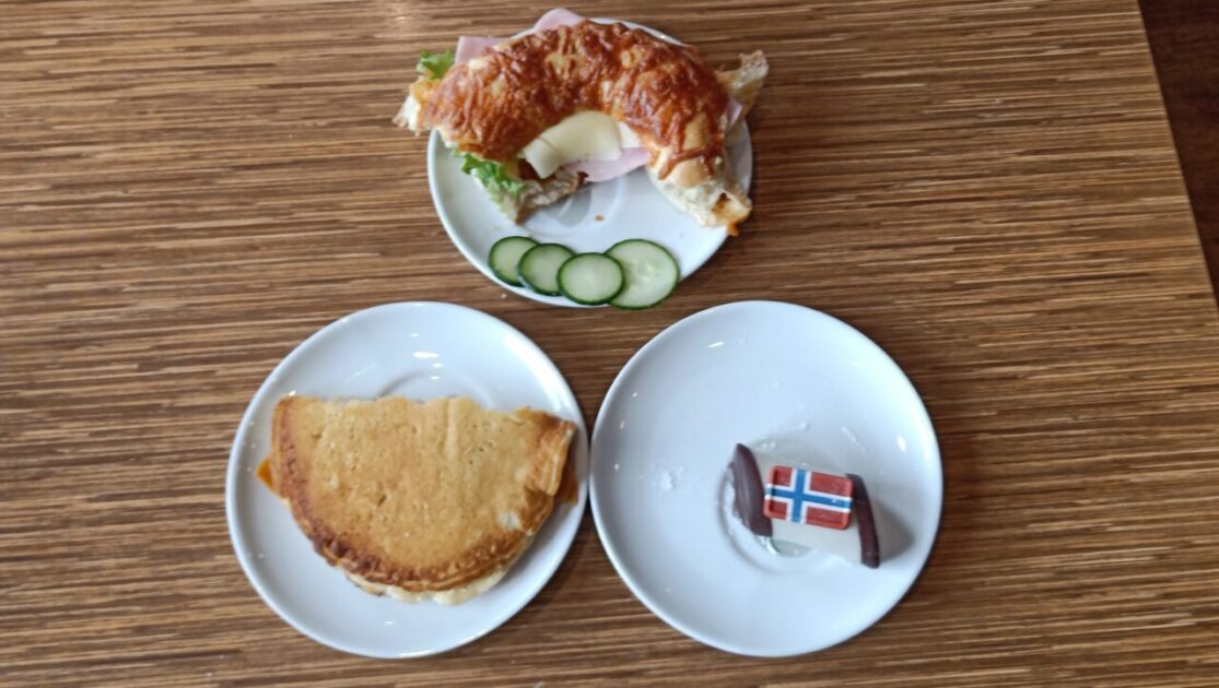 Today’s lunch: a ham, cheese and salad (minus the cucumber) roll, brown-cheese pikelet, and a Dammsugare with a white chocolate Norwegian flag.