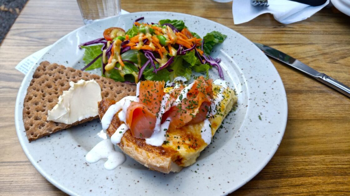 Our destination today was the lake side town of Sigtuna, about 30 minutes from where we were staying; it has a population of 10,000 people and a lot of presumed history. The old buildings in the town are craft shops, souvenir stores or cafes, so with its history and café culture it attracts a lot of tourists. My lunch today was a vasterbotten, that’s a quiche made with special vasterbotten cheese from a small dairy factory. It came with salmon on top, everything in Sweden either has salmon or shrimp on top, I feel like they are trying to revive the 70s shrimp cocktail or possibly still living in the past. No photo of Roger’s lunch as the baked potato topped with shrimp was off the menu and his substitute was not Swedish.