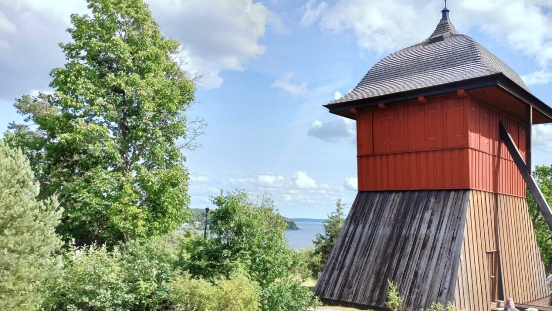 A stave bell tower on Klockbacken Hill, the original 17th century belfry burned down in 2016 and was rebuilt “according” to old drawings.