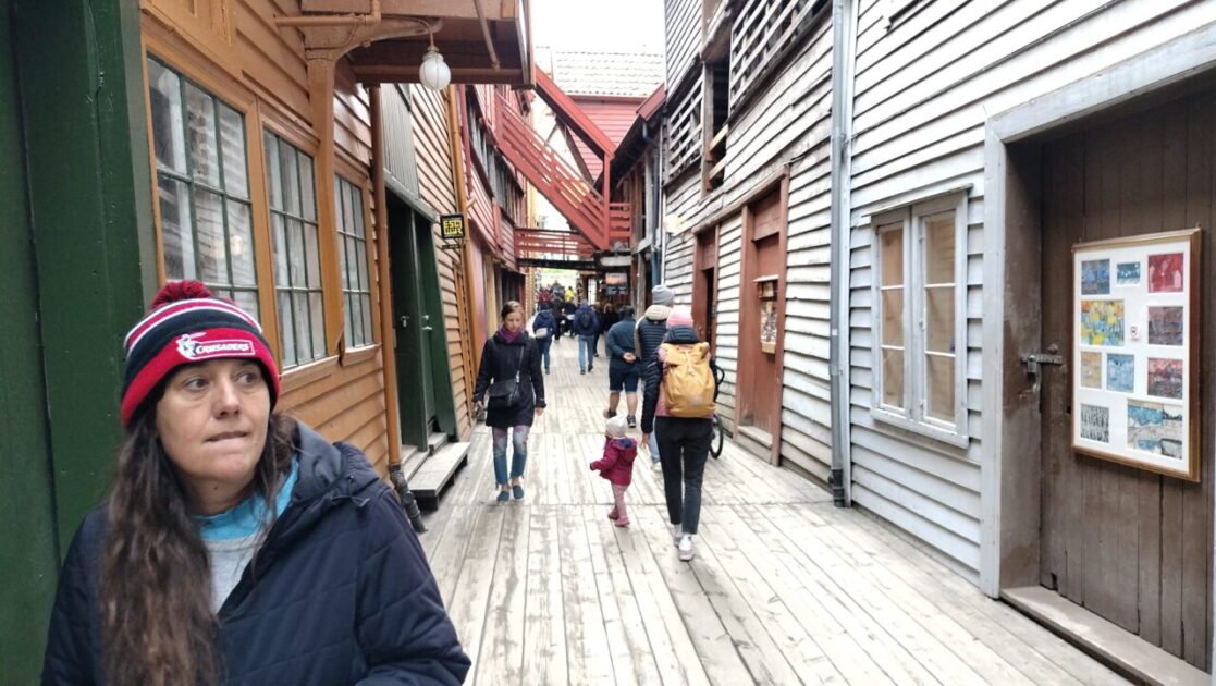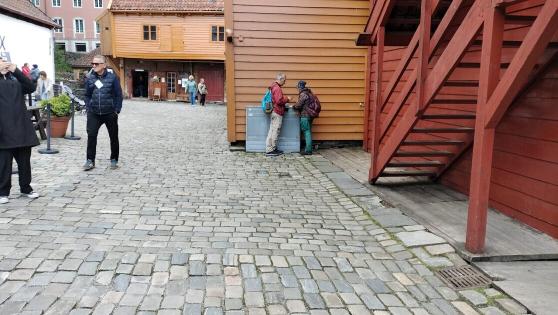 The second financial outlay nearly happened at the Bryggen UNESCO World Heritage Site of colourful wooden buildings, some from the 1700s. The buildings are constantly being renovated and are of various ages because of fire, wars and general deterioration. The photos are of the front, rear, alleyway and two geocachers being muggled by us. Most of the buildings are used as tourist traps, with the sale of art, souvenirs, craft materials and clothing.