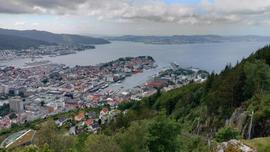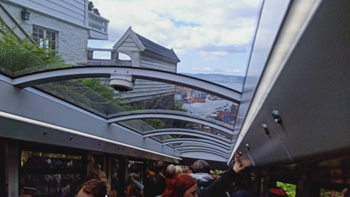 Time to part with some money – so we went up the Floibanen Funicular (NZ$54 for two adults return). You could pay for a one-way ticket and walk down in 45 minutes. Bergen also has a cable car on the same mountain side, but it isn’t within walking distance of the city centre. Once at the top of Floyen mountain you get magnificent views over the harbour and city. Although a bit cloudy, the sun was out and it was so surprisingly warm that we had to stop for cold refreshments after geocaching; more money expended. From here you can see the cruise ships in the harbour, only one today; from the wharf area we couldn’t see any ships, which is quite good because it doesn’t spoil your view of the area.