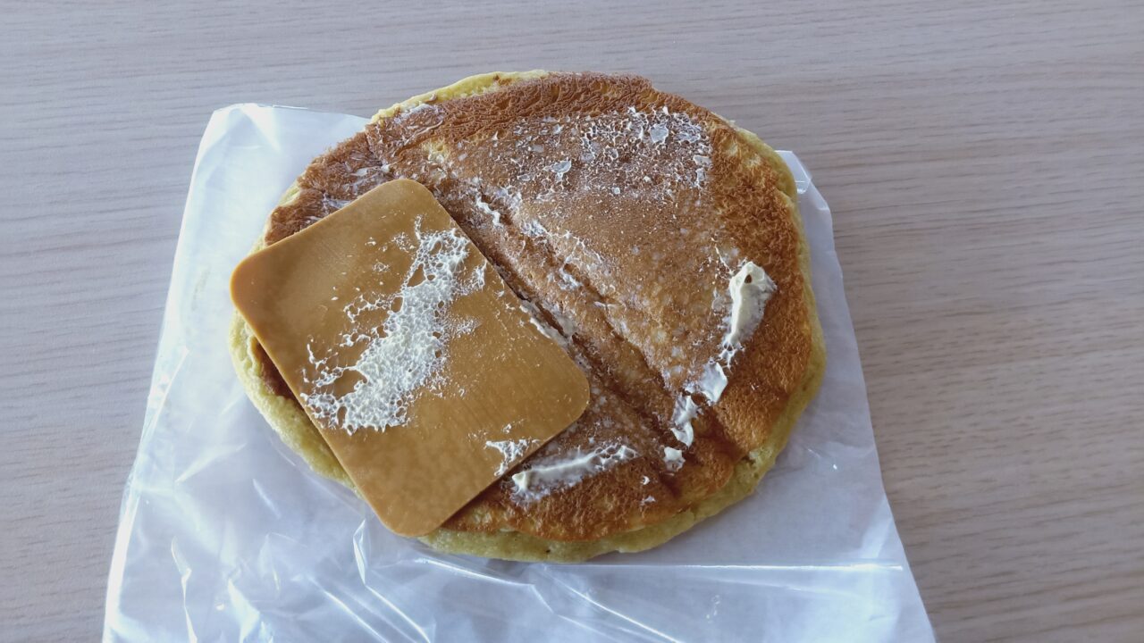 Brown cheese and butter pikelet. Brunost or brown cheese is just cheese boiled until it caramelises.