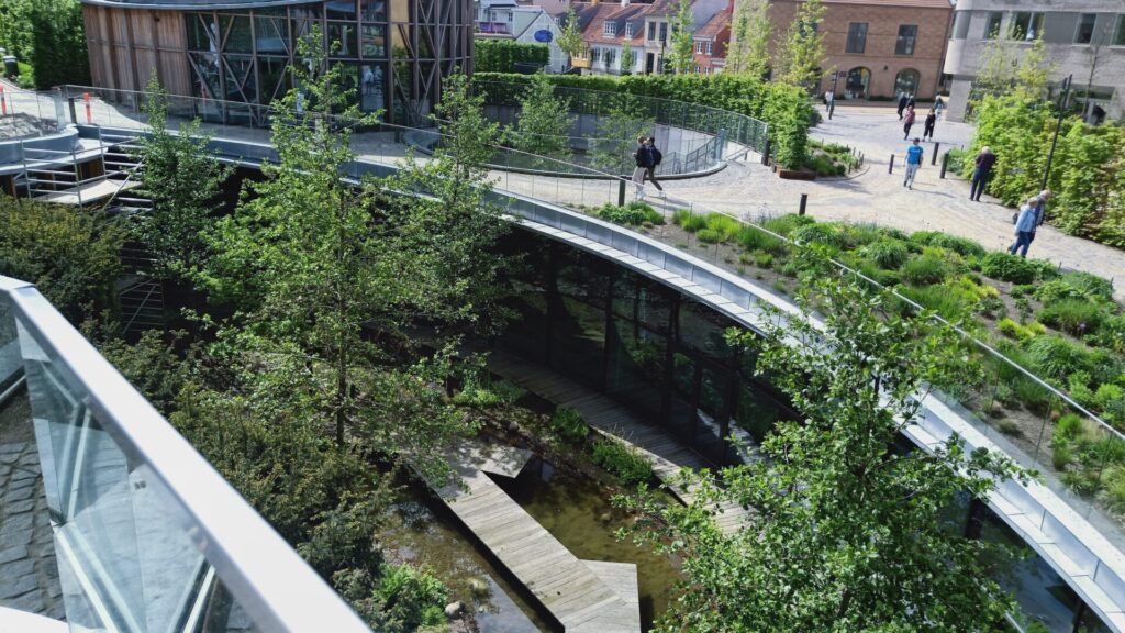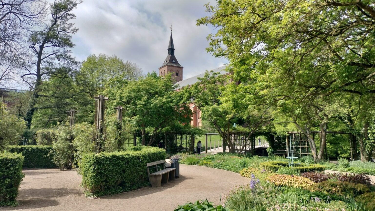 The next goal was to find a parking spot close to town that was free, so we visited the Munke Mose Gardens and found lots of car parks with a 2 hour limit and appropriately displayed our parking disc. Odense is a pretty, clean and vibrant city. The main centre has lots of green spaces and cafes which were well utilised today by all the Danes bridging the gap. We don’t have a photo of Munke Mose park but here is one of H C Andersen Haven Park’s monastery garden and cloisters.